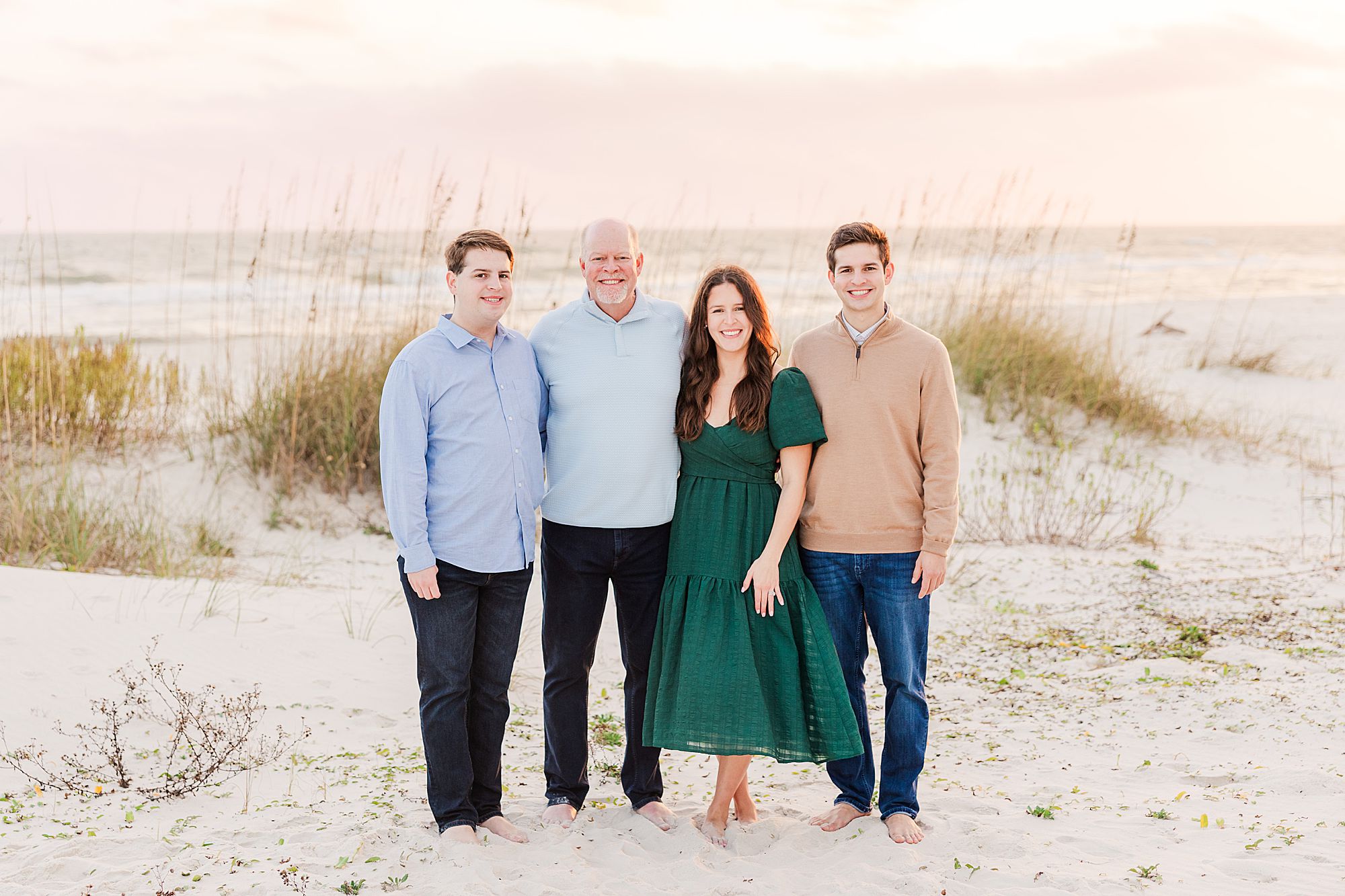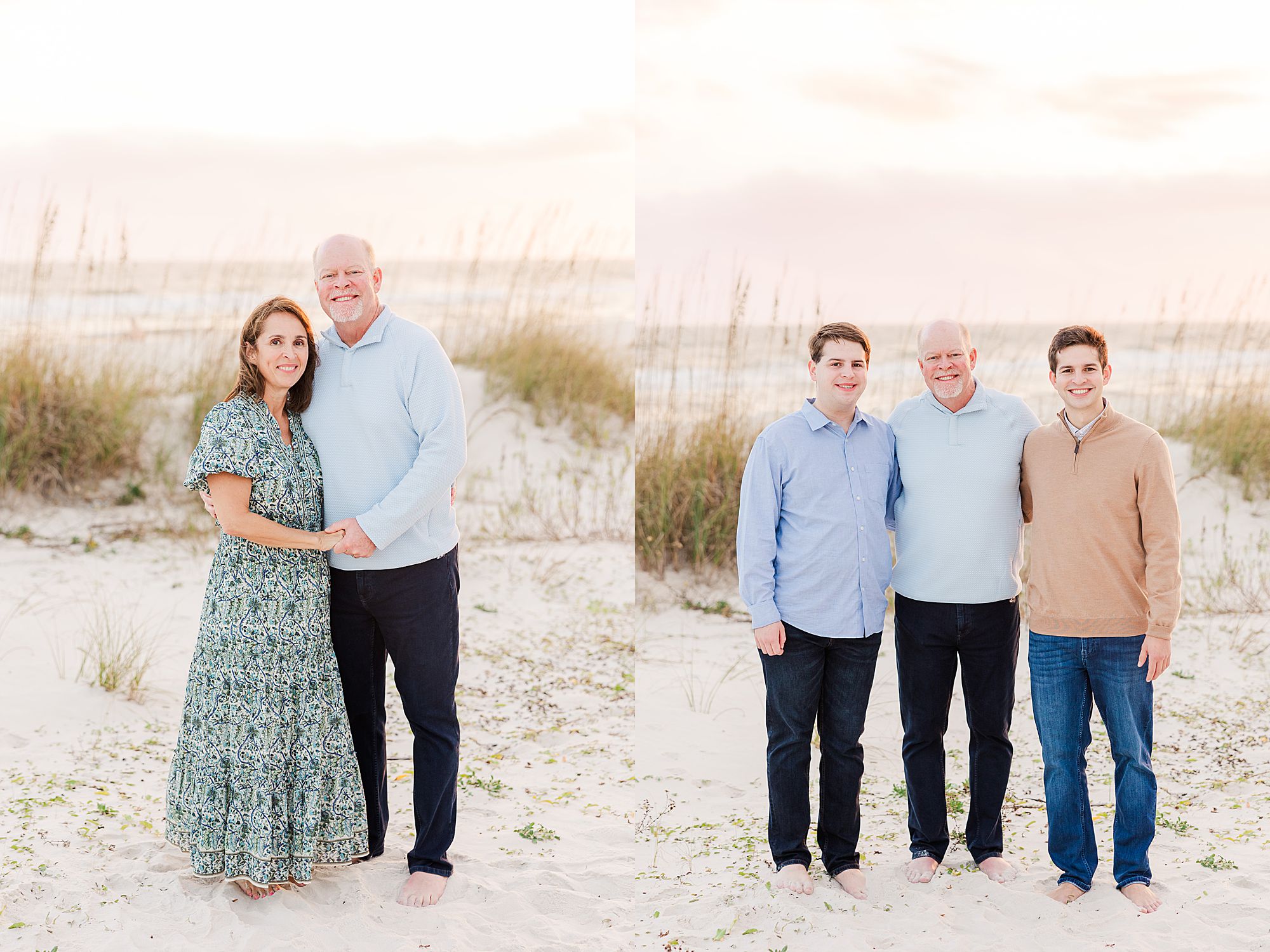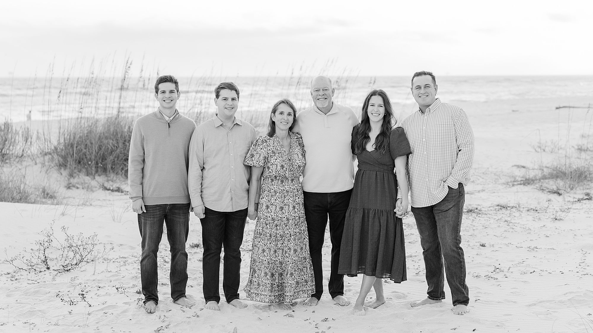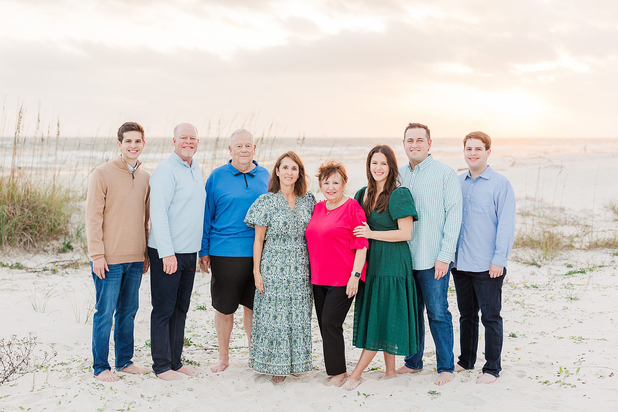 The setting was perfect. They had sandy bare feet, warm light just before sunset, and the Gulf behind them with sea grass glowing in the breeze. Their group included Grandma on the mom’s side, mom and dad, two sons, a daughter, the daughter’s husband, and dad’s dad. Talk about effortless – all we had to do was walk out their boardwalk. What a dream setup for a relaxed, effortless session!
