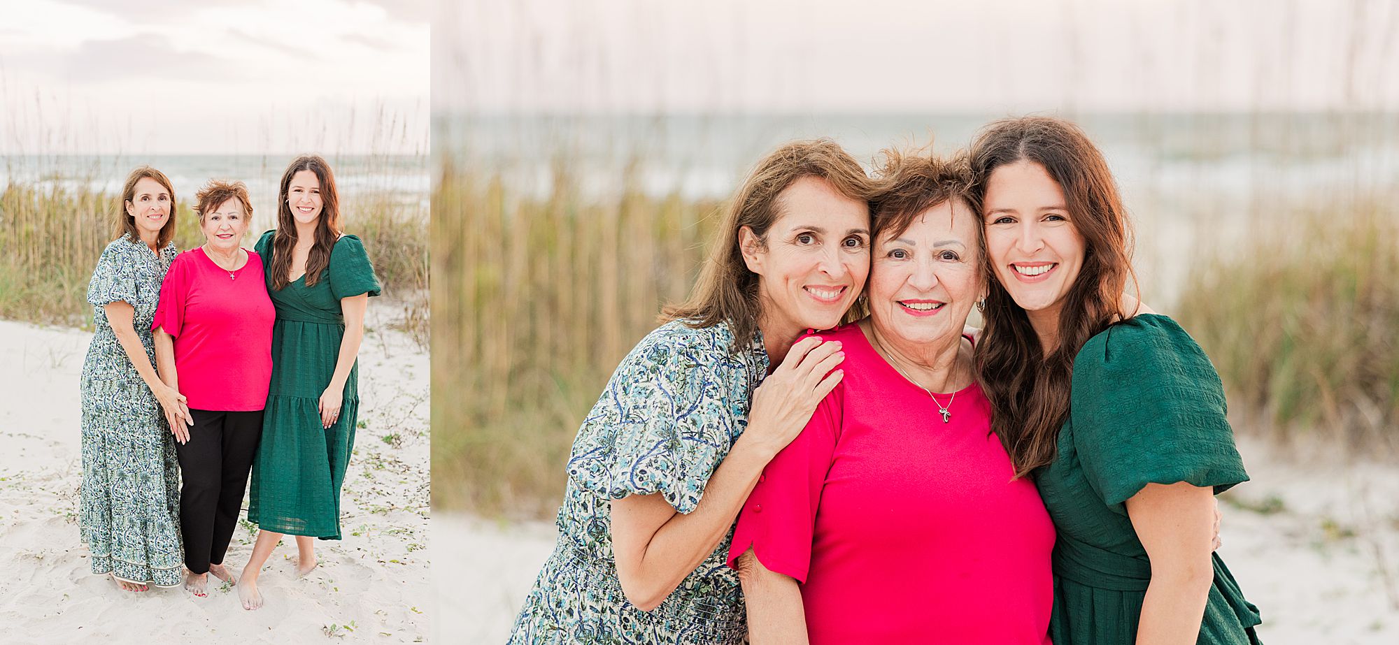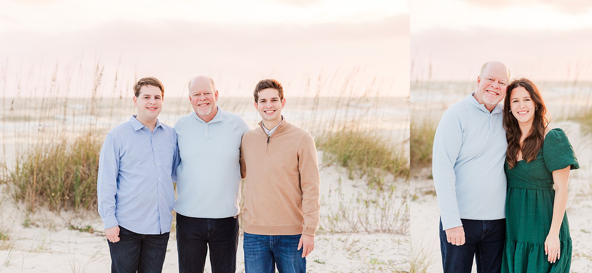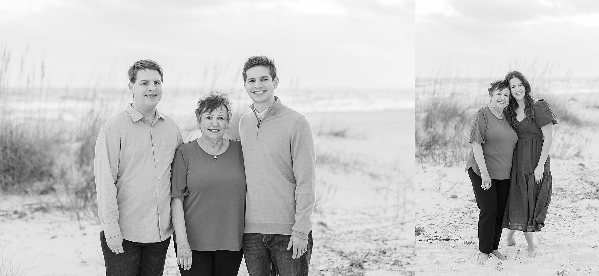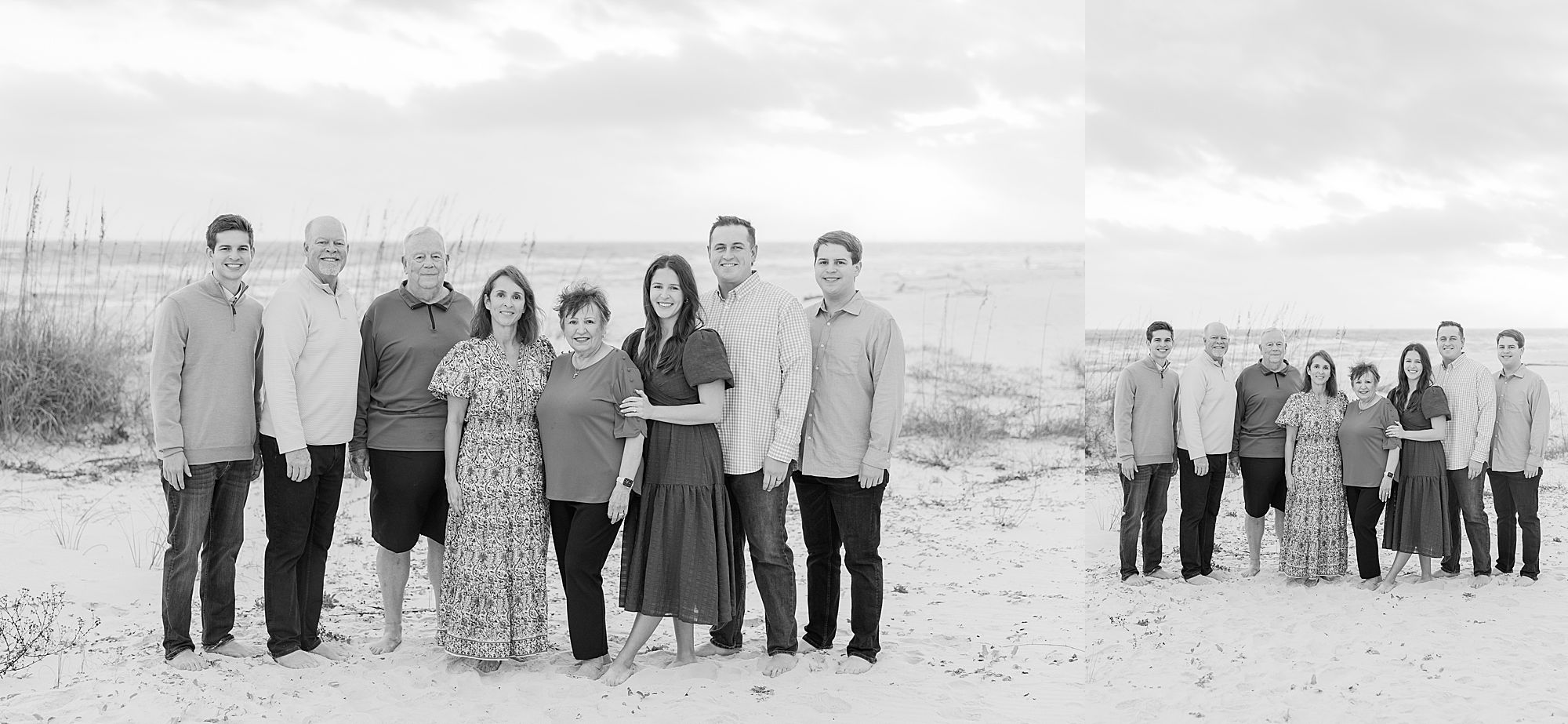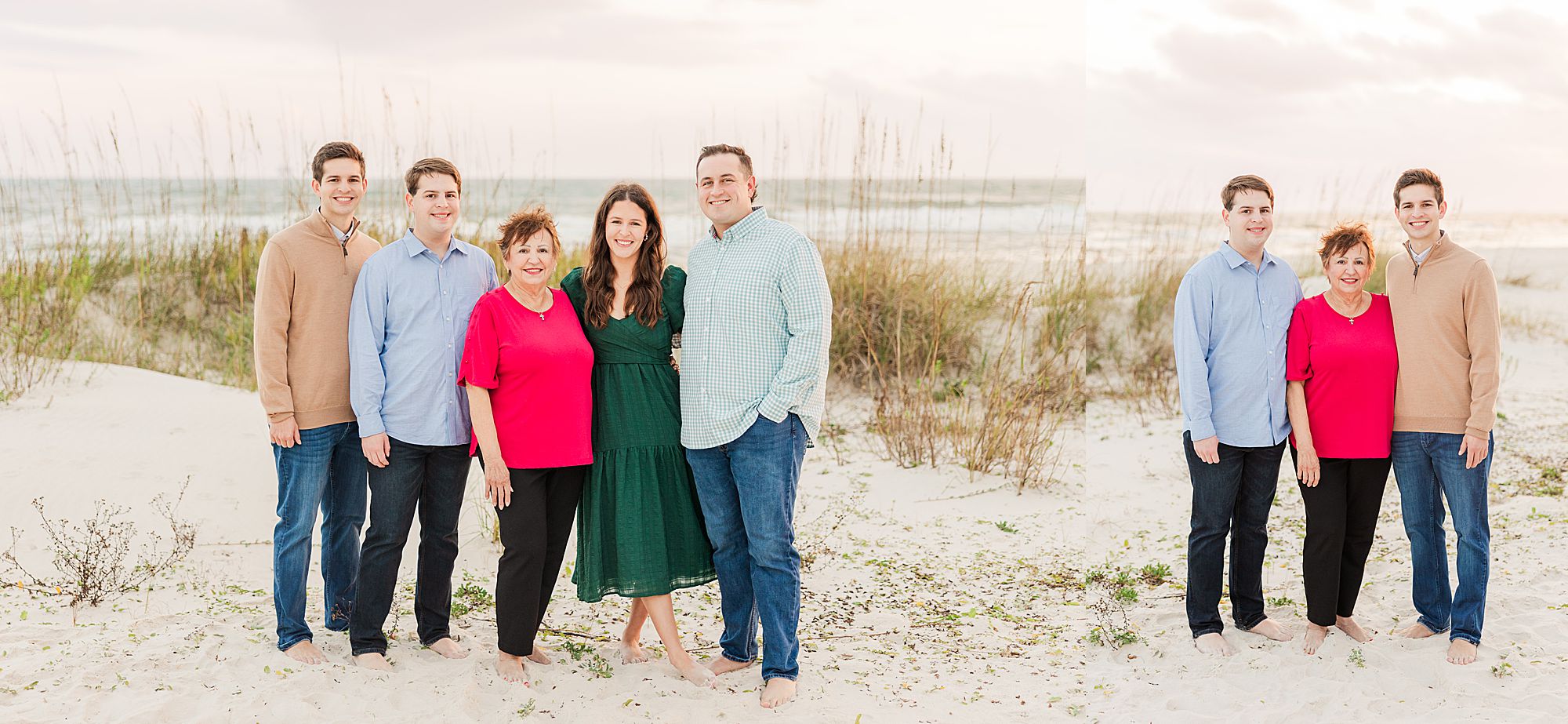 The setting was perfect. They had sandy bare feet, warm light just before sunset, and the Gulf behind them with sea grass glowing in the breeze. Their group included Grandma on the mom’s side, mom and dad, two sons, a daughter, the daughter’s husband, and dad’s dad. Talk about effortless – all we had to do was walk out their boardwalk. What a dream setup for a relaxed, effortless session!