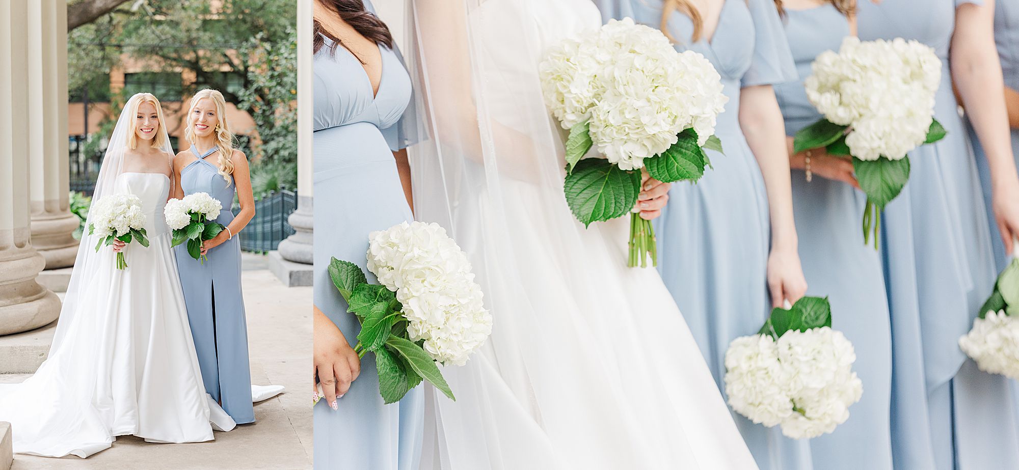One thing I really loved for this wedding day is that the bridesmaids tied their own bouquets. They used bunches of fresh white hydrangeas wrapped in classic white ribbon. The arrangements were simple, organic, and beautiful, and even more special knowing the bouquets were lovingly created by hand.
