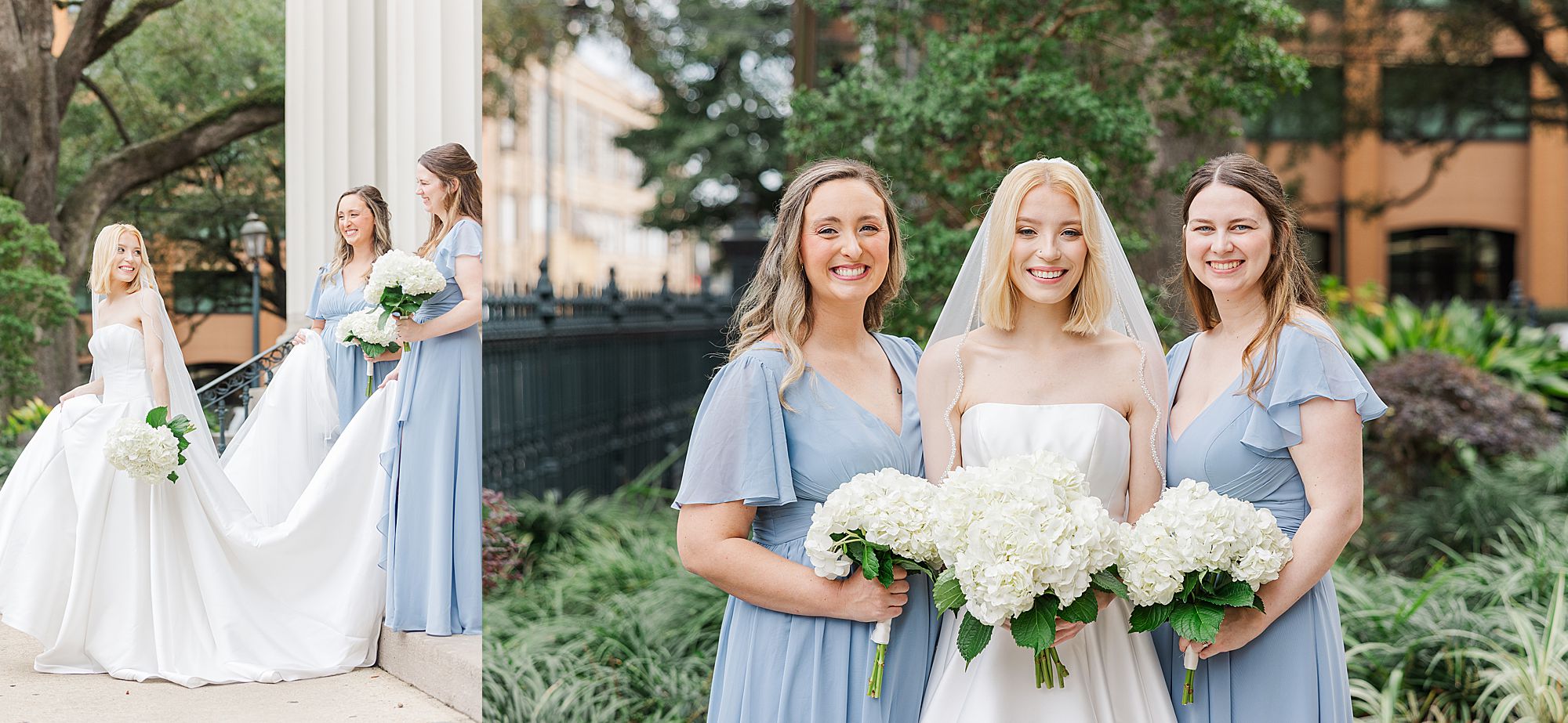 The wedding party walked from the hotel to The Cathedral Basilica of the Immaculate Conception, allowing us to take portraits before the mass began. The church offered multiple backgrounds within steps of each other, large beautiful columns, iron gates, stunning trees and more. Bridal party portraits, family portraits, and solo bride and groom images were captured in this stunning space.