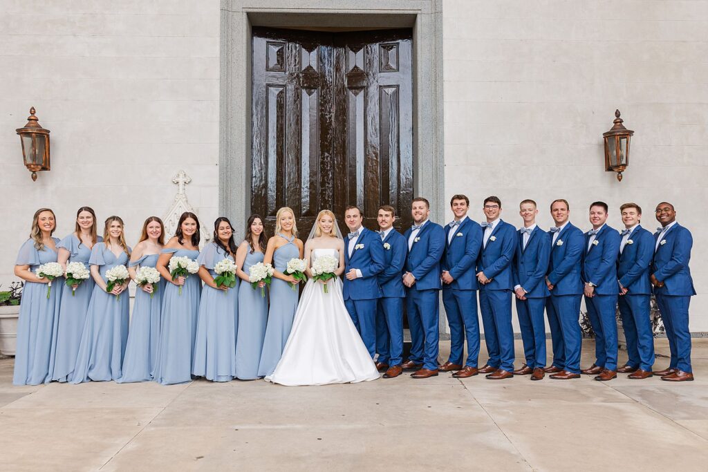 Rebecca wore a stunning strapless ball gown paired with a cathedral length veil that brought timeless elegance to every portrait. Her makeup style was soft bridal glam with gentle contour, glowing skin, and a romantic eye. Her bridesmaids wore dusty blue floor length dresses, each with a slightly different silhouette that added movement and dimension to group photos.